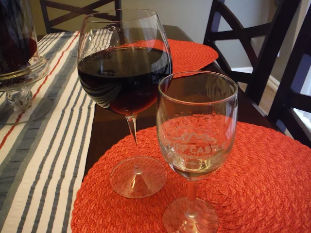 We needed wine after getting dinner ready, we had to work around Chloe, in the sink, She managed to spray some bleach sort of by/in her eye. I don't think it was too bad as she was not distressed at all, but Mom was!! It would have hurt, wouldn't it? Then the shrimp somehow got dumped on the floor....5 second rule prevailed & none of us has gotten sick :) I cut my finger a small bit on the food processor blade, those things a sharp!!